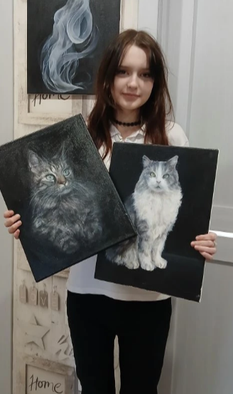 А еще Настя очень интересно пишет картины, посвященные братьям нашим меньшим.